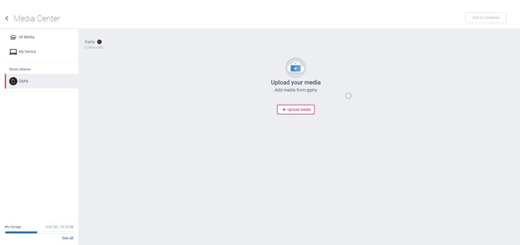 3. In the Media Center, under the “Stock Libraries” you have the Giphy. Click it and then click the “Upload Media” button in order to access the Giphy library.
