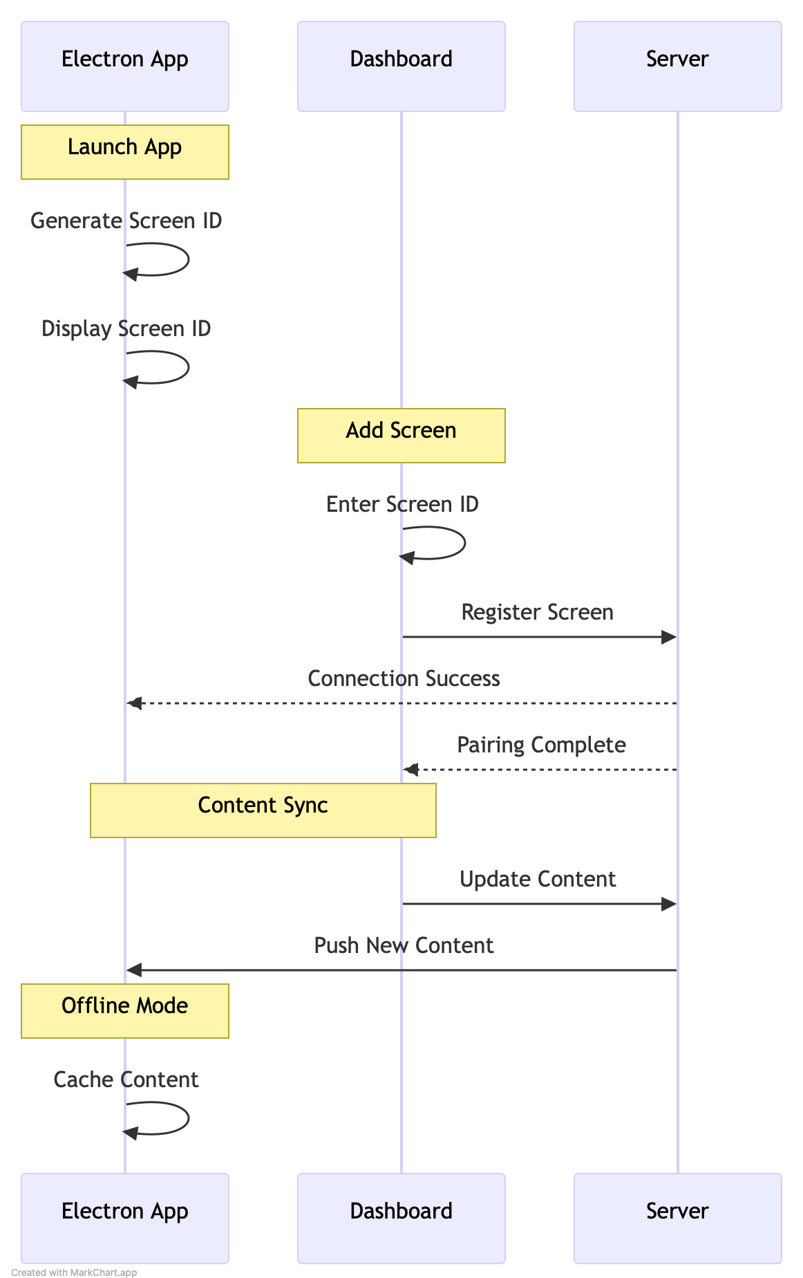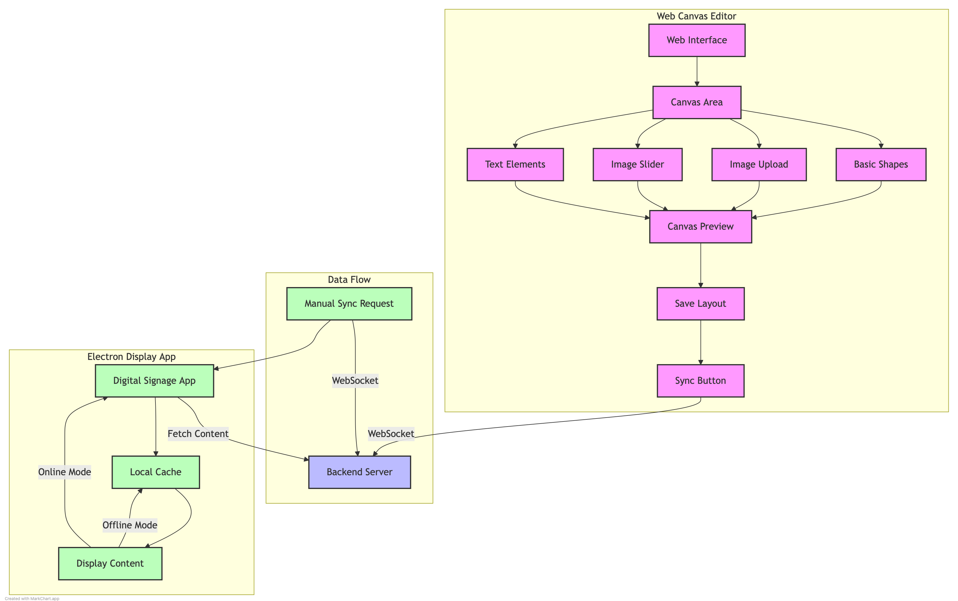 Content is synced to the Electron app (which acts as a digital signage display) via a sync button using WebSockets