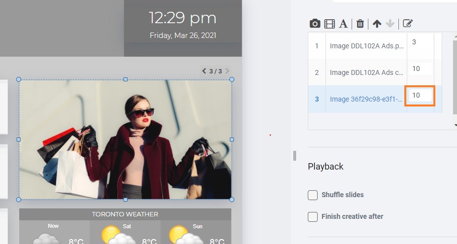 The slide show widget for digital signage enables you to display any number of images, videos, PowerPoint Slides, text and other media to play and rotate through. You can set the playtime of each media file to rotate through by any number of seconds or minutes.